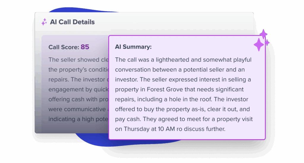 With Ai Lead Overviews get caught up on any lead in 30 seconds, not 10 minutes. AI pulls together property info, seller intent, and conversation history — so you’re never fumbling before a callback.