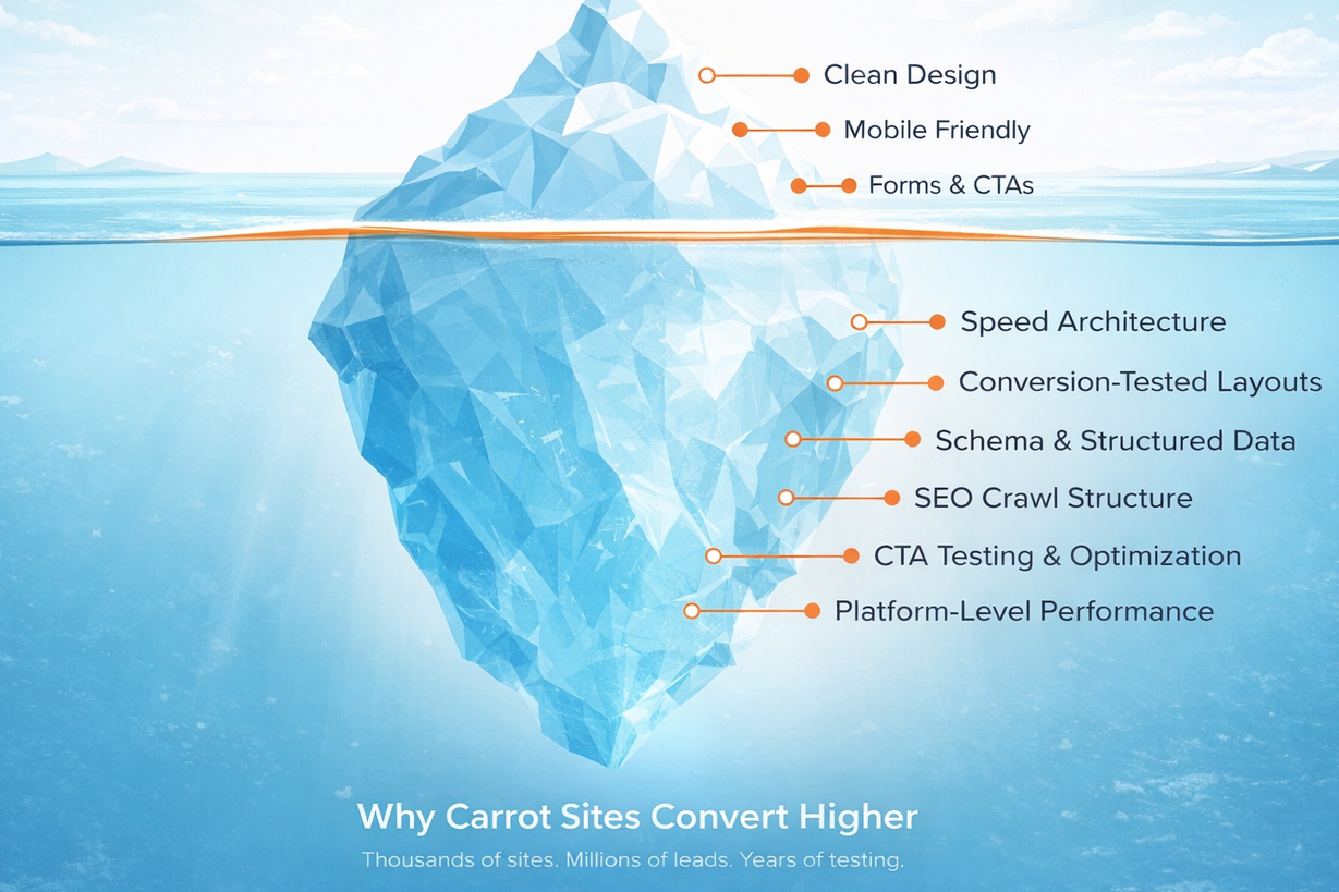 When someone builds a site that “looks like Carrot,” they’re copying the 20% you can see. The 80% that actually drives your rankings, conversions, and revenue? That’s invisible. And it’s the difference between a site that looks good and a site that closes deals.